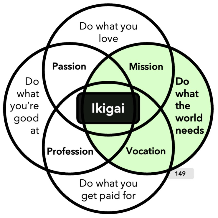 Ikigai literally means “the reason for being”. It shows four perspectives of purpose where each can be valid on its own.
